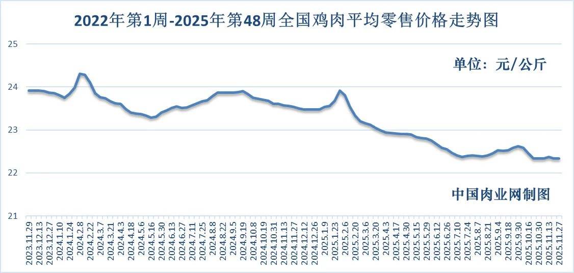 白条鸡肉批发全国平均价格为8.85元/斤, 今天比昨天下降↓1.7%